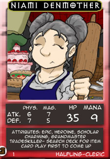 Fast forward to January of 2006, and just as 'Mum was getting ready to go in for surgery, she received prezzies from Jeremy - trading card images with an EQTC theme, and some lovely EQTC wallpaper! At the time, since things were a tad chaotic, they ended up scattered around the site as a mini-scavenger hunt, but the hibernating halfling never got around to doing anything more with them. Now that I am recovered, and have wiped the egg off my face, I'm finally making them a bit easier for folks to find. Wheeee! Watch out for that rolling pin!!